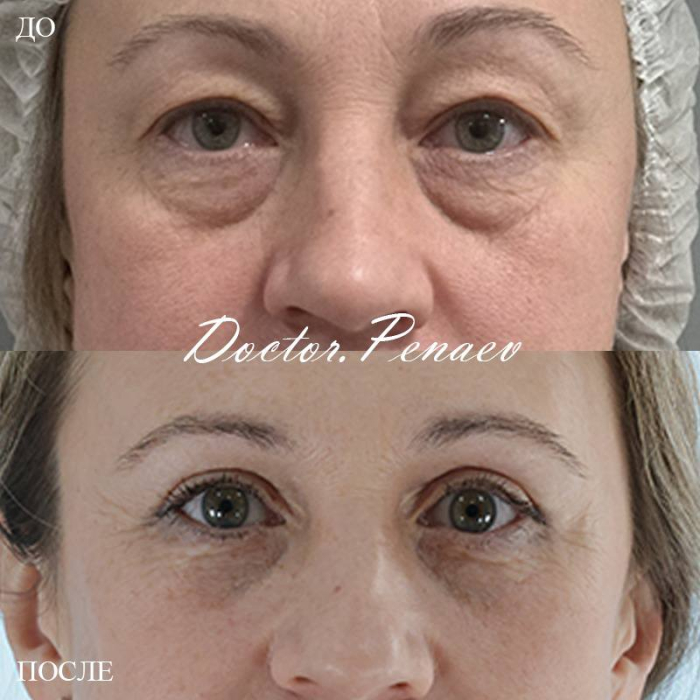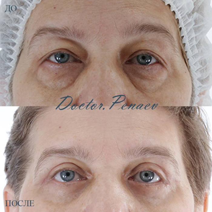 Пациентка доктора А.А. Пенаева, 48 лет. Выраженная отвислость и жировые грыжи верхних и нижних век. Выполнена блефаропластика верхних и нижних век, кантопексия. Результат через 3 месяца после операции