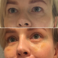 Верхнте веки вообще без синяков и отёков. Нижние на второй день отекли сильно и есть синяки. Сегодня пятые сутки отёк сошёл, есть желтизна и небольшие кровоподтёки. Но я вообще склонна к гематомам. Пью траумель С в таблетках и мажу мазью траумель С. Думаю, что на полную реабилитацию надо две недели