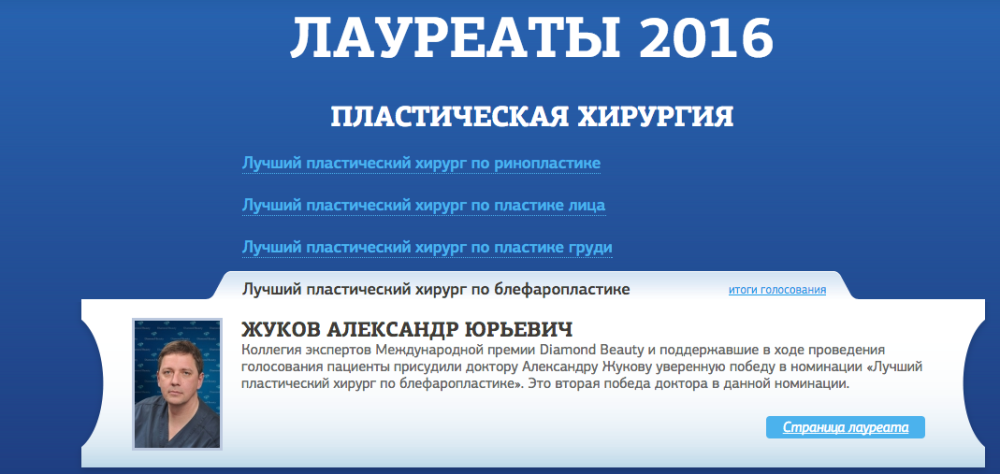 Признанный пластический хирург. Победитель многих премий в том числе как лучший специалист по блефаропластике. Александр Юрьевич гениальный пластик, очень порядочный и тактичный. Глаза после операции стали молодыми и лучистыми, чего даже в молодости не очень наблюдалось. Благодаря Жукову вернулись легкость и позитив. Шик, блеск, красота — вот такие сейчас эмоции!