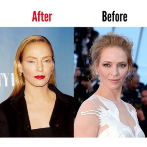 Тот факт, что лицо актрисы на «свежих» снимках выглядит совсем иначе, не оспорить. Если внимательно присмотреться к фотографии, можно увидеть, что Ума Турман немного поменяла цвет и форму бровей, предпочла отказаться от туши и теней. Визажист звезды, Трой Сьюрэтт, прокомментировал изменения в лице актрисы. Он признался, что причиной ажиотажа стала сила макияжа!