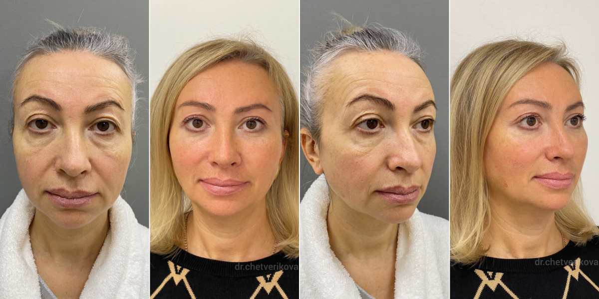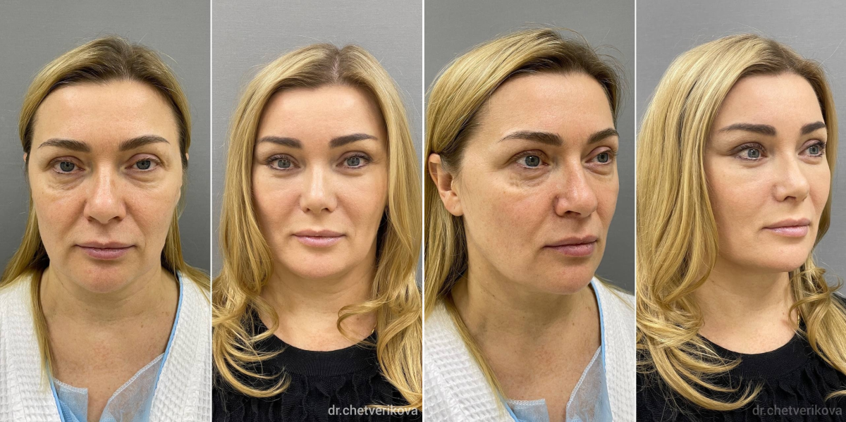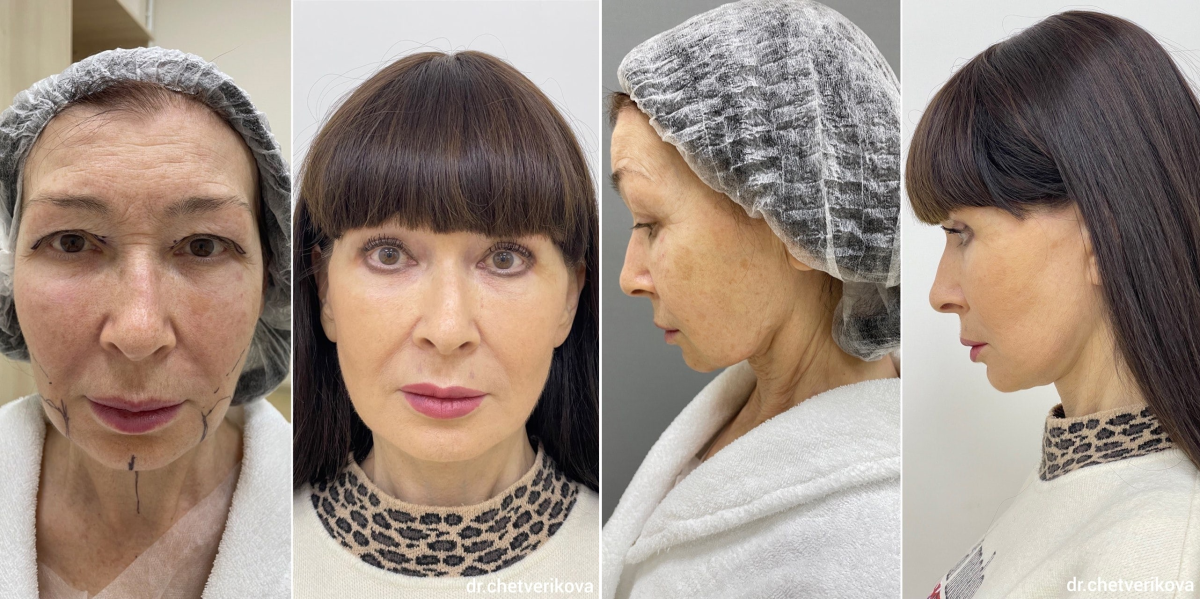 Пациентка пластического хирурга Марины Четвериковой до и через 1 год после операции. Ей были выполнены SMAS-подтяжка нижней трети лица и шеи и верхняя жиросохраняющая вторичная блефаропластика