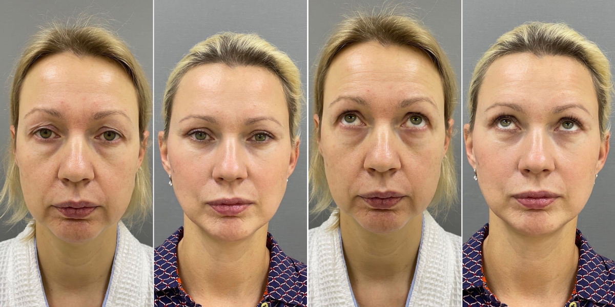 Пациентка доктора Четвериковой до и через 3 недели после операции. Выполнили эндоскопическую периорбитопластику, верхнюю и нижнюю блефаропластику. Ещё сохраняются минимальные остаточные послеоперационные явления, но в целом лицо выглядит полностью зажившим.