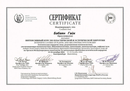 • 2007 г. — Курс аугментационной маммопластики с матрикс системой Allergan (MCGHAN и CUI), Севан, Армения.